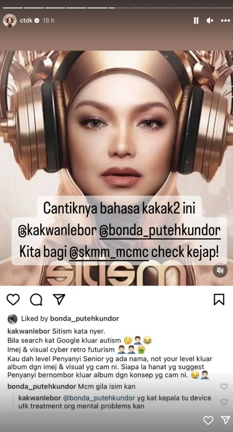 One Instagram user named @kakwanlebor wrote, “The album is called ‘Sitism’. When I searched on Google, the result that came out was autism.” The netizen continued by saying, “You’re an established senior artiste. These images and visuals are not on your level. I wonder which troll suggested Malaysia’s number one singer come up with an album using this concept.”