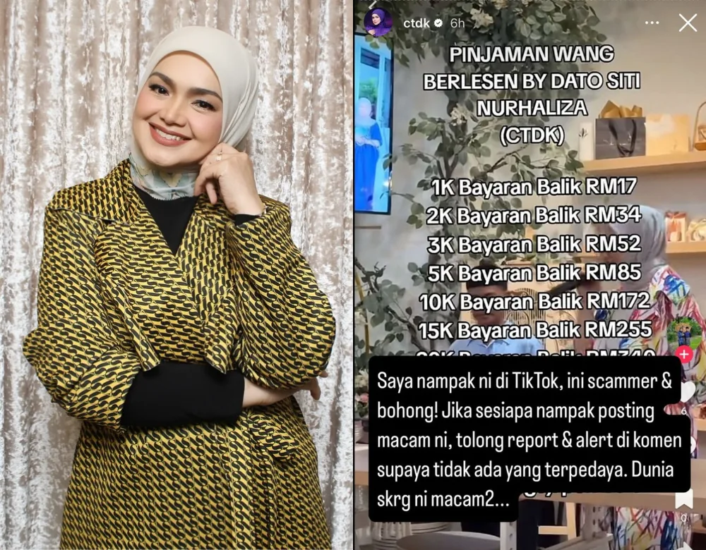 Netizens have called out the user for using the singer’s name. However, she continues to claim that the business is endorsed by Siti Nurhaliza. In response, the 46-year-old posted on her Instagram Stories, denouncing the post and the TikTok account. In the captions, Siti Nurhaliza wrote, “I saw this on TikTok. This is a scammer and a lie! If anyone sees this posting, please report and alert the rest in the comments so others won’t fall for this.”