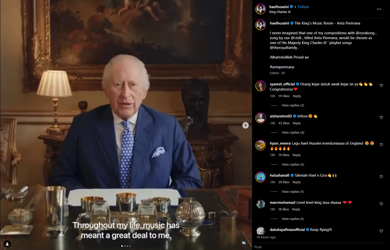The song’s producer and composer, Hael Husaini, was also just as flabbergasted, writing on Instagram: “I never imagined that one of my compositions with @ezrakong, would be chosen as one of His Majesty King Charles III’s playlist songs. Alhamdulillah, [proud to be Malaysian]”. On Instagram, praise and appreciation ensued. User @/i.am.khairul.anwar congratulated Hael and Ezra for producing a “valuable and exclusive” world-class piece that was appreciated by international listeners. Meanwhile, @Md.ikmns commented on the “royal vibe” that “Anta Permana” has a melody and lyrics exude.