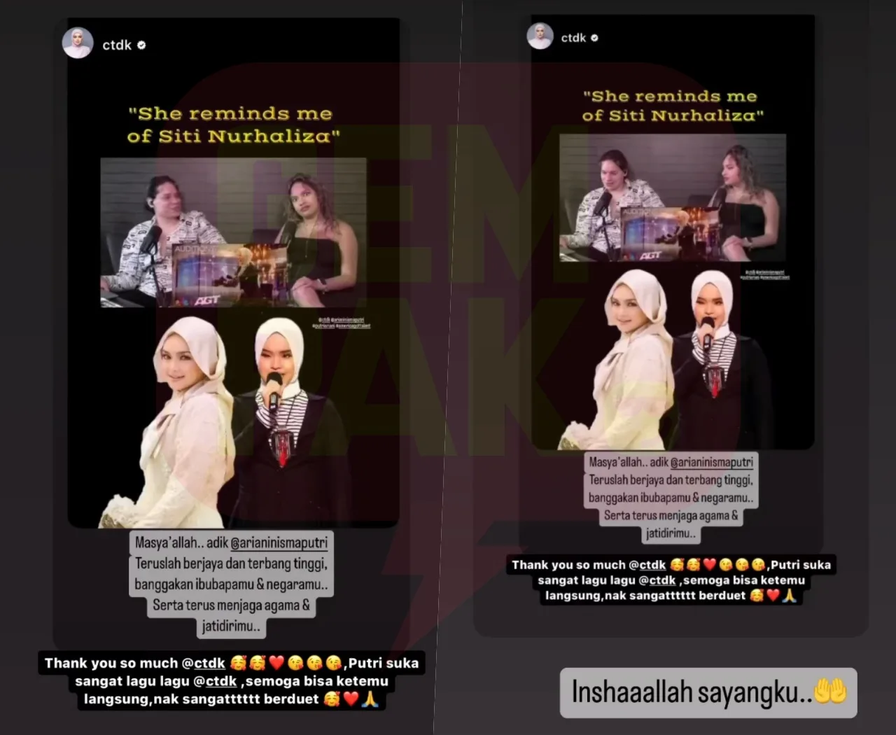 Siti took to her Instagram Story to share her response to the YouTuber’s comment. She wrote to Putri, “Keep flying high, make your parents and country proud, and maintain your religious image and identity.” Following that, the 17-year-old quickly responded, “Thank you so much @ctdk. I really like your songs. Hopefully we can meet in person. I’d like to perform together with you,” to which the “Percayalah” singer replied, “If God wills, my dear.”