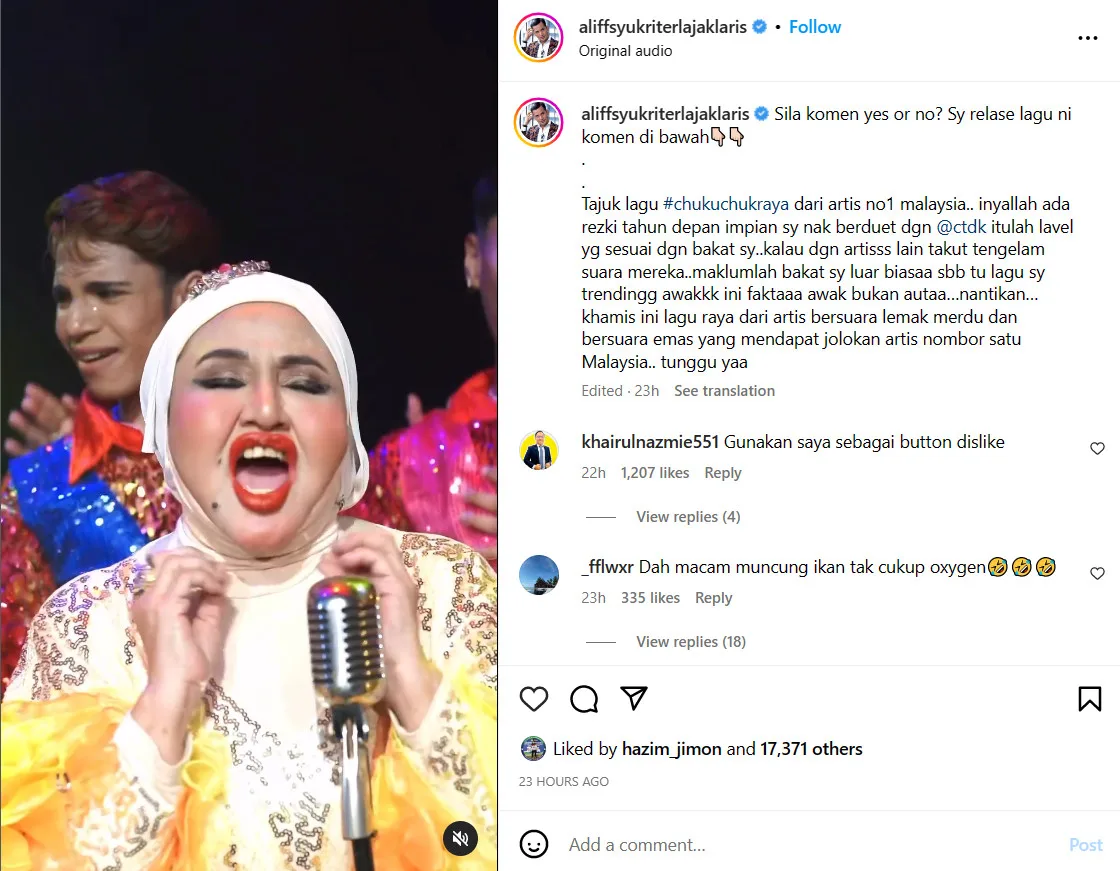 Through a post shared on his IG, Aliff also expressed his hopes to collaborate with TokTi in the future. “God willing, I’d like to release a duet song with @ctdk next year. She’s on a par with my talent. If I were to release a collab song with other artistes, I’m afraid that I’ll just outshine them. Well, my talent is outstanding, that’s why my song is trending. I’m speaking facts.”