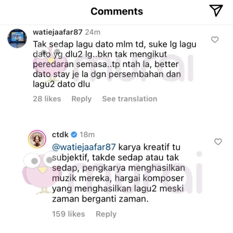 In her reply, Siti said, “Art is subjective. There is no good or bad. Artists produce their music and appreciate the composers who produce songs despite the changing times.”