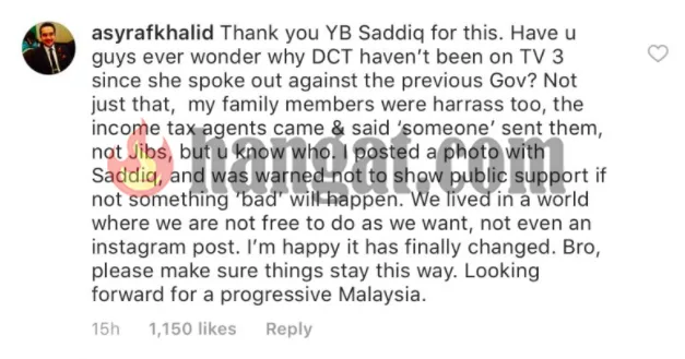 “Have you ever wondered why DCT (Datuk Siti Nurhaliza) haven’t been on TV3 ever since she spoke out against the previous Government?” wrote Asyraf. He also shared that his family members have been harassed in the past. They were also threatened for showing public support to our current PM.