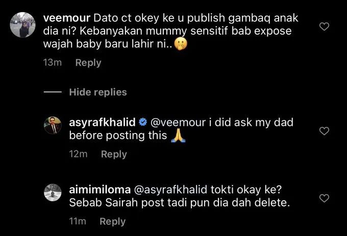“I swear, I think Asyraf (Khalid) is very rude. It’s common sense for you not to upload someone’s newborn photo on social media, regardless if he’s your step-sibling or what. Even TokTi didn’t upload a full frontal face picture like that,” Twitter user @Aimimiloma expressed.