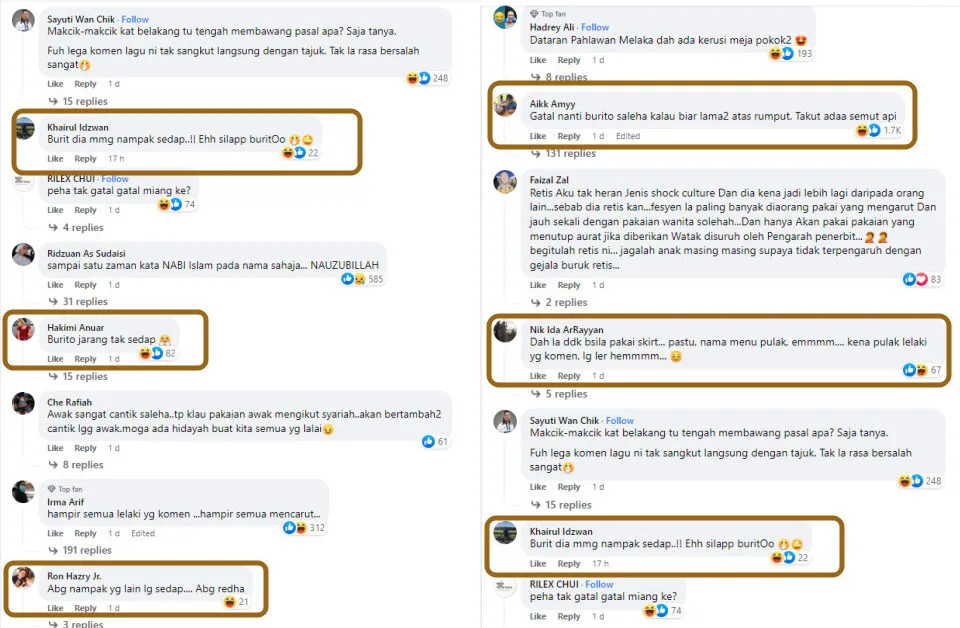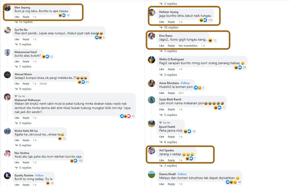 Not to mention, there were also some dirty-minded netizens who left sexual remarks in the comments section of the Facebook post. “Your ‘burito’ will become itchy if you seat on a grass for a long time. (I’m afraid) that the fire ants will bite,” one netizen commented. “Her ‘burit’ (Malay slang for female intimate part) is very delicious! Oops, I mean buritoo,” another FB user wrote.