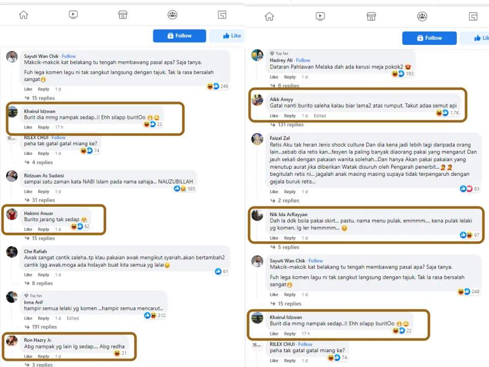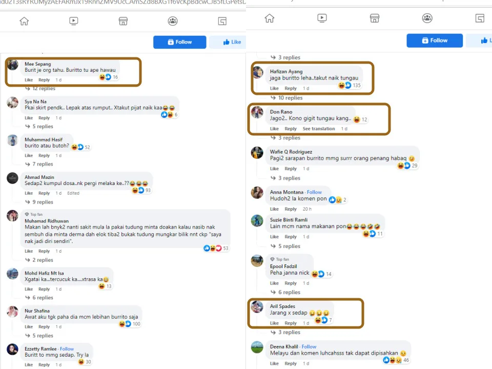 Not to mention, there were also some dirty-minded netizens who left sexual remarks in the comments section of the Facebook post. “Your ‘burito’ will become itchy if you seat on a grass for a long time. (I’m afraid) that the fire ants will bite,” one netizen commented. “Her ‘burit’ (Malay slang for female intimate part) is very delicious! Oops, I mean buritoo,” another FB user wrote.