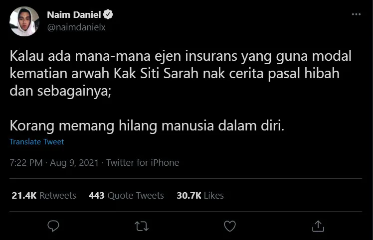 In related news, singer and actor, Naim Daniel also requested for any insurance agent to avoid using the story of Siti Sarah’s passing as a means to increase their sales capital. The singer made the remark on his official Twitter account on Monday (9th August).