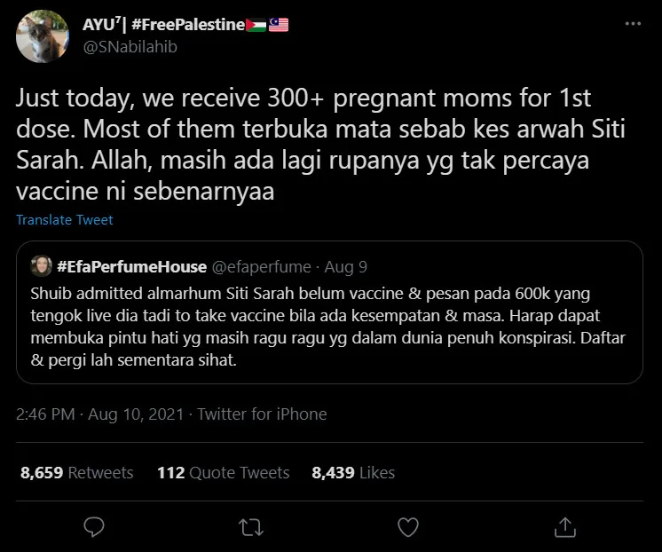 As a result, Siti Sarah’s death has stirred the public to be more aware of the severity of the virus, especially for pregnant ladies. A Twitter user updated that many pregnant mommies have since gone to receive their first dose of vaccination. Most of them, she informed, became aware of it because of Siti Sarah’s incident.