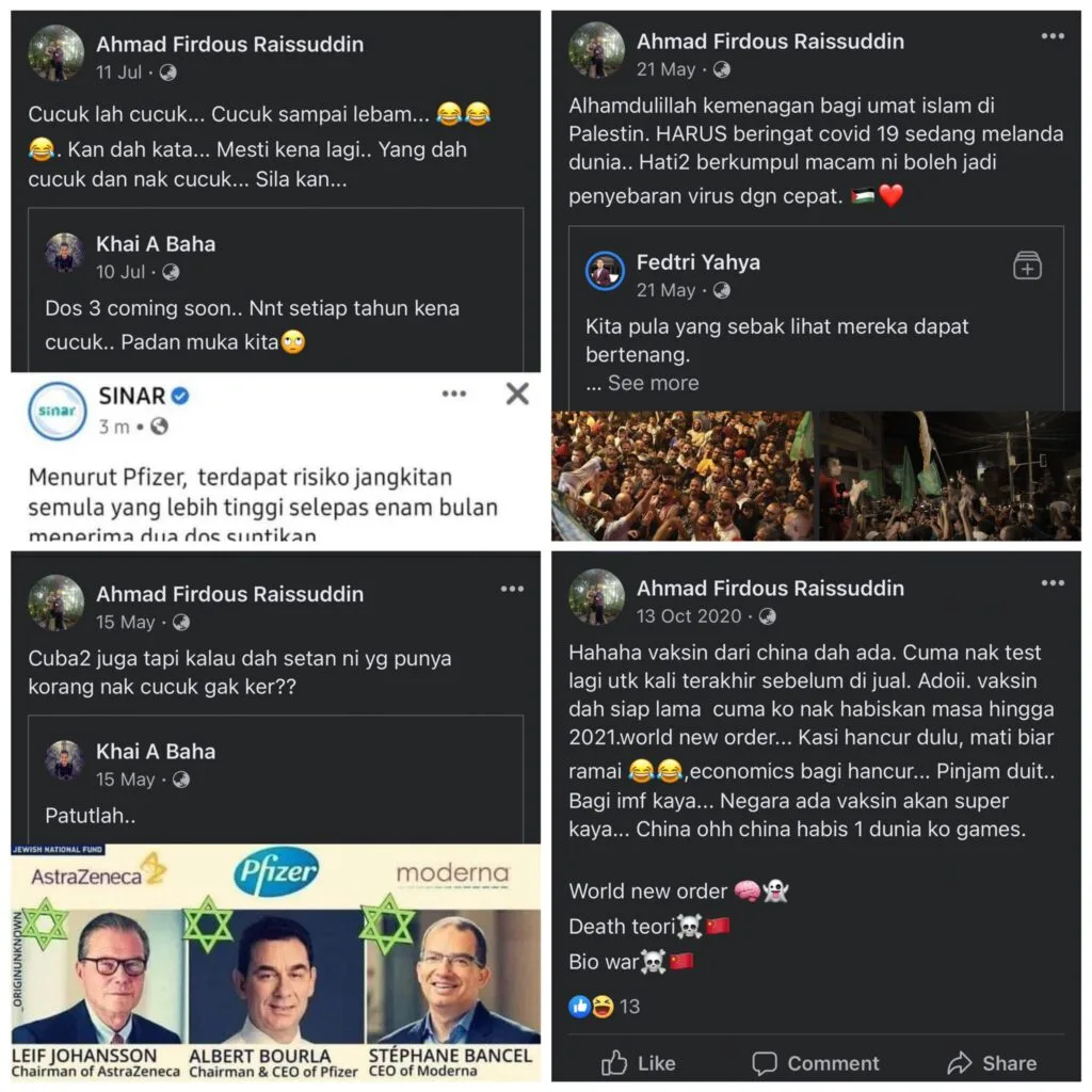 Based on the series of screenshots shared by a user known as @arifeddy12 on social media, Firdous had been seen expressing his strong views against the Covid-19 vaccine on his FB posts on several occasions.