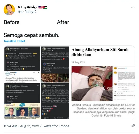 The Twitter user later explained in another thread, “Guys, this tweet is purely to spread awareness for everyone to go and get vaccinated. We are getting there! Let’s help @JKJAVMY to achieve herd immunity in Malaysia. Please don’t pray for bad things (to happen to Firdous) please. Just pray for him to recover soon, and he’ll be aware about this.”