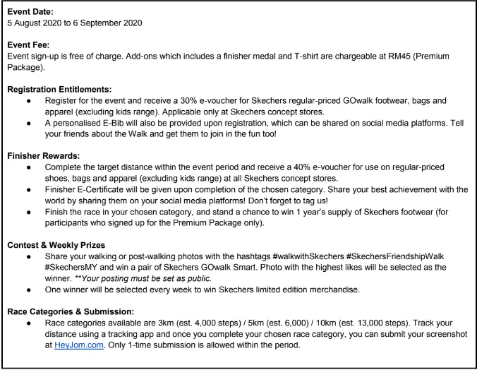 “We are glad to be able to bring back the Skechers Friendship Walk in 2020 — an annual tradition that we look forward to continuing, even in this extraordinary year. The virtual run format that we are introducing this year is more flexible and allows more people to take part from anywhere and anytime within the one month period. We hope this event will create special memories for participants to stay fit together and bond with their loved ones,” said Ms. Zann Lee, Vice President of Skechers Southeast Asia.