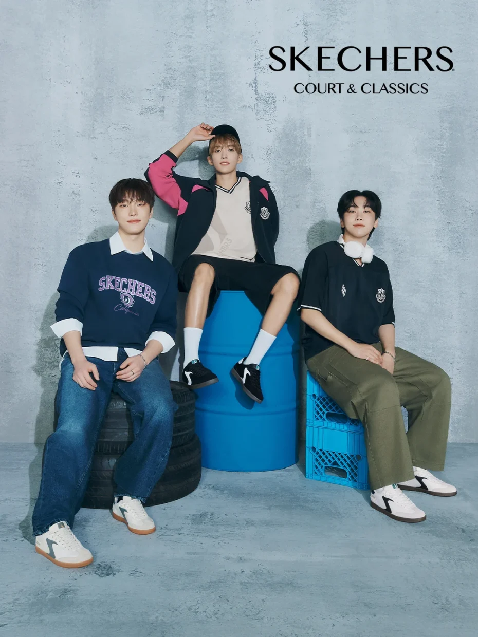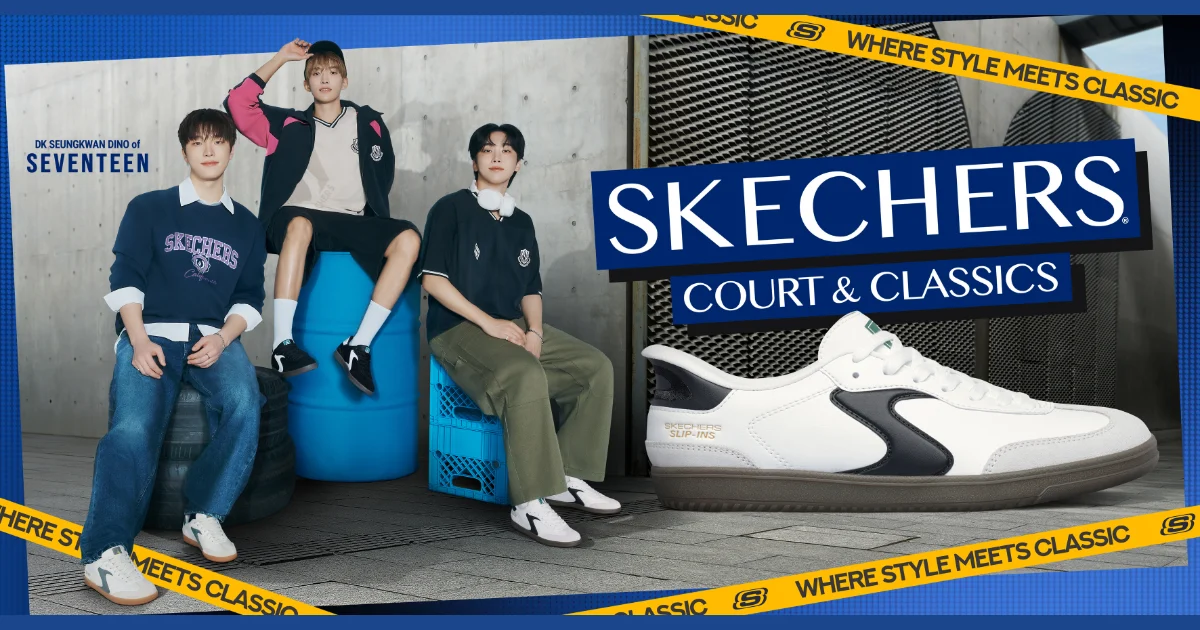 Introducing Skechers Slip-ins®: Court Classics Hotshot for men and Skechers Court Classics Hotshot for women, this collection celebrates spontaneity, self-expression, and the joy of slipping seamlessly from one moment to the next, with SEVENTEEN’s DK rocking the Black White shade, SEUNGKWAN in White Black, and DINO sporting the Light Gray Blue.