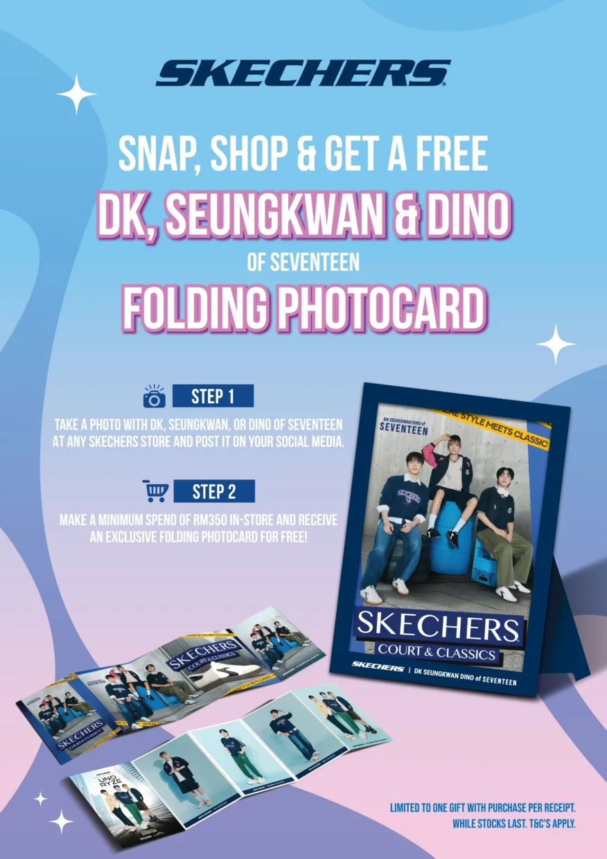 Each selected Skechers concept store will feature a standee of a different member, giving fans the chance to seek out their favourite bias, from DK’s “Happy Virus” charm to SEUNGKWAN’s “K-pop Professor” energy and DINO’s confident “Maknae on Top” spirit. Spot one, snap a photo with the standee, poster, or lightbox, share it on social media, and with every RM350 spent, fans will receive a limited-edition Folding Photocard.