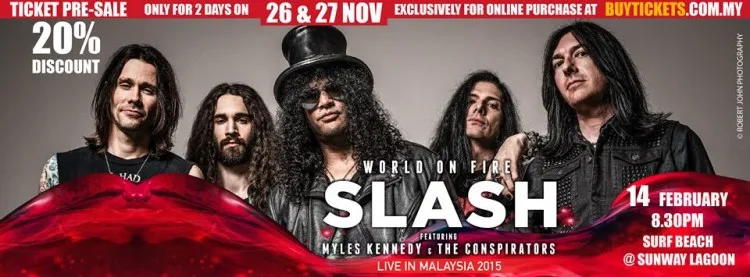 Ticket prices for Slash World On Fire Featuring Miles Kennedy and The Conspirators Live in Malaysia are priced at RM168, RM268 and RM348. Pre-ticket sales will run from November 26th (Wednesday) to November 27th (Thursday) exclusively for online purchase. Fans who purchase tickets during pre-ticket sales are entitle 20% ticket prices.