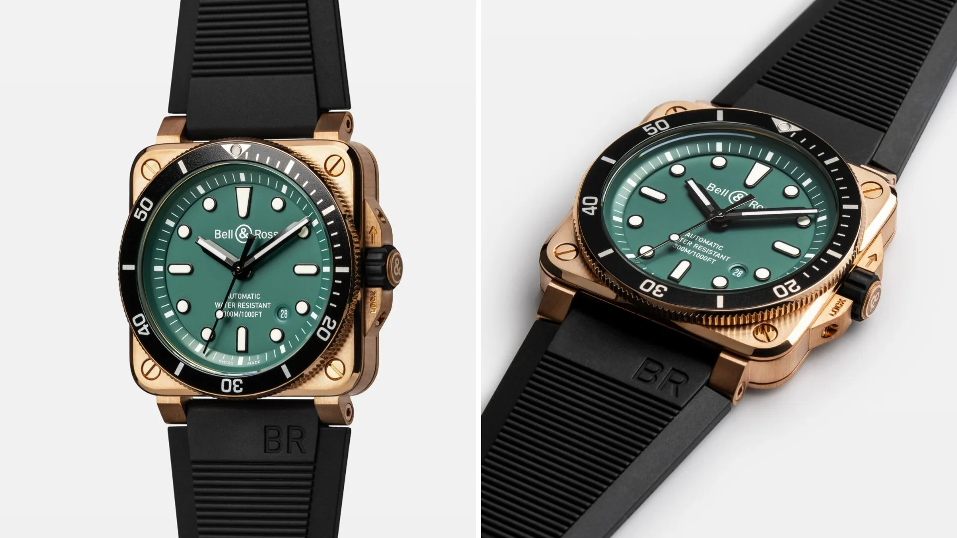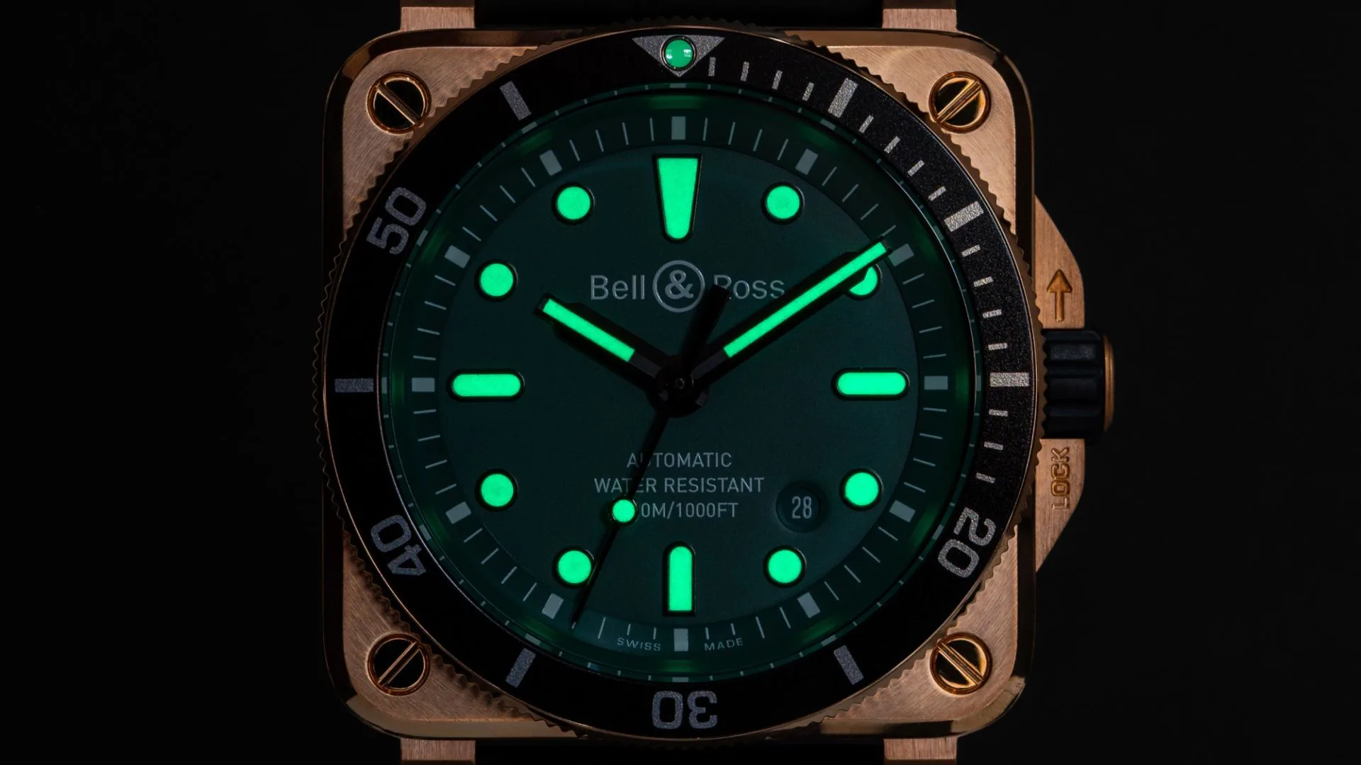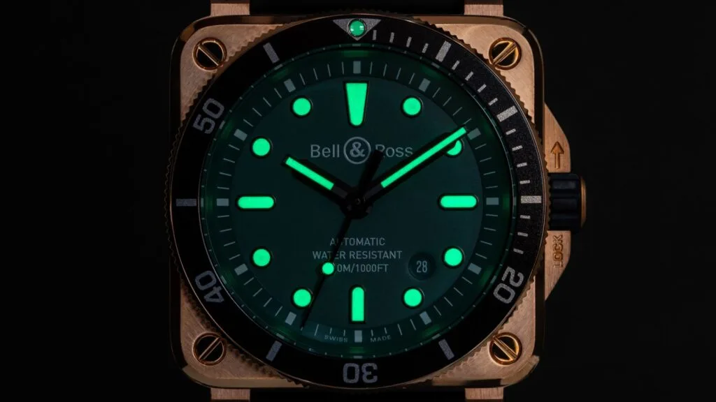 Finally, to cap off this entire timepiece, the BR 03-92 Diver Black & Green Bronze takes on a new-retro look. The expressive watch face immediately marks a shift, with its new green dial adding a naturalist dimension to the heart of this diver’s instrument. Under its sapphire crystal lens, the dial has large, glow-in-the-dark hands and digits that tell you the time – whether you are out on a bright sunny day, or exploring the deep blue sea.