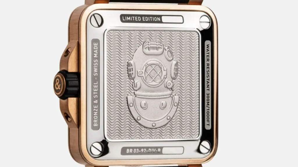 Furthermore, even though it is intended to transform, the BR 03-92 Diver Black & Green Bronze has been designed to function properly as technical equipment, and for diving to record depths. It is no coincidence that the iconic diver’s helmet, traditionally made of bronze, is now engraved on the back of BR 03-92 Diver Black & Green Bronze watches in hypoallergenic stainless steel.