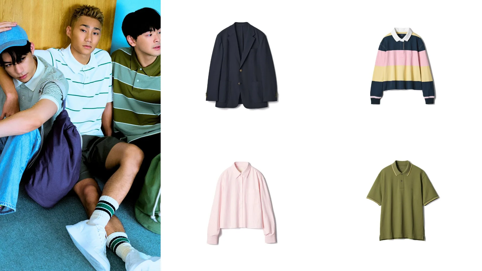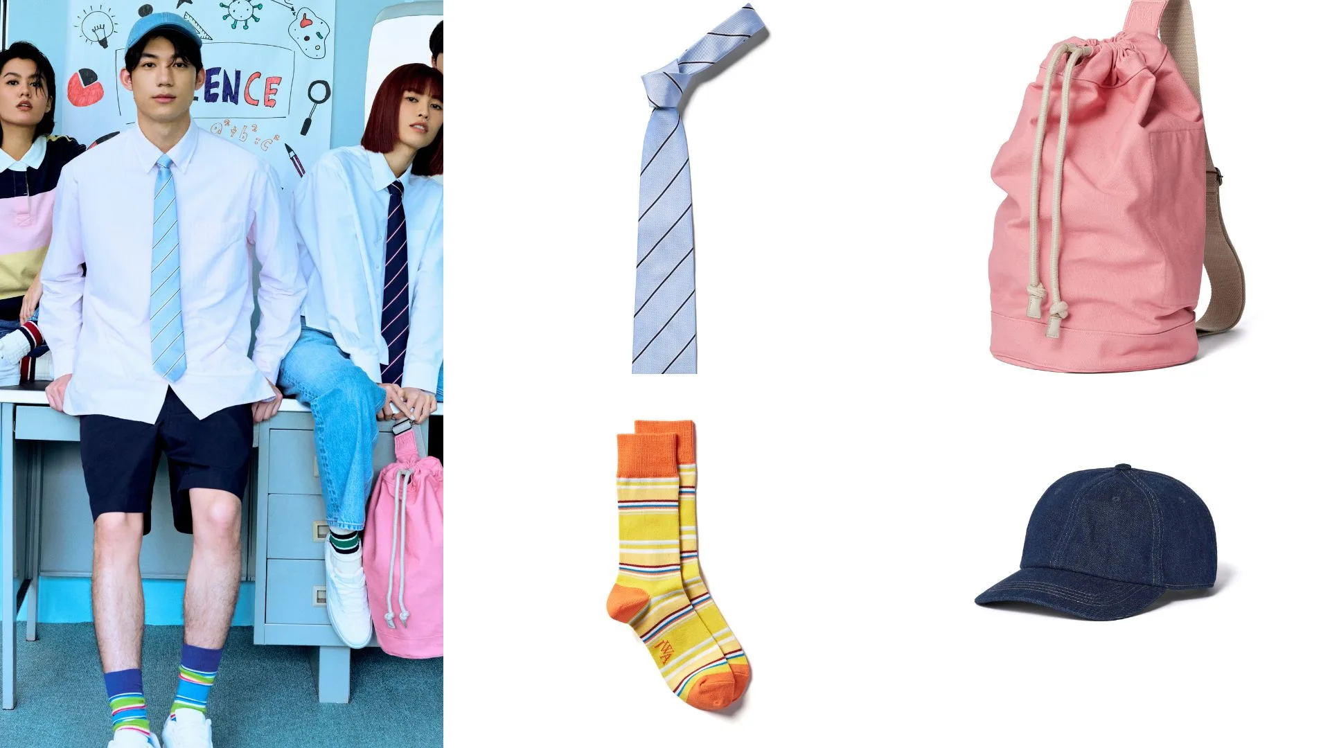 Women’s oxford shirts in classic white, blue, and striped patterns, and rugby polo shirts in striking pink and yellow colours, feature a short, boxy silhouette. The Miracle Air blazer, iconic for its preppy look, is made with high-performance materials to be lightweight, stretchy, and quick drying. Another point to note is the accessories, such as bags, socks, and neckties, are presented in playful colours.