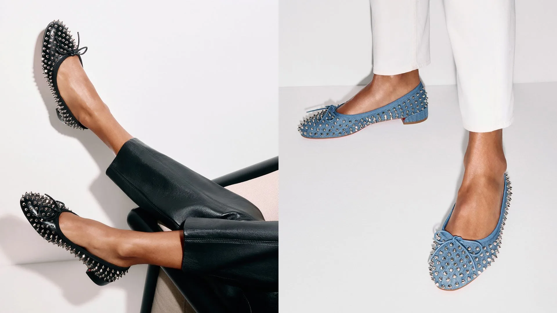 The newly-released Sweetie Jane Spikes ballerina embodies rock-chic for the Fall/Winter 2024 season, flawlessly combining comfort and high fashion. It features Maison Christian Louboutin’s distinctive spikes, wrapped from the toe to the round tip, placed on a 15mm block heel atop the iconic red sole.