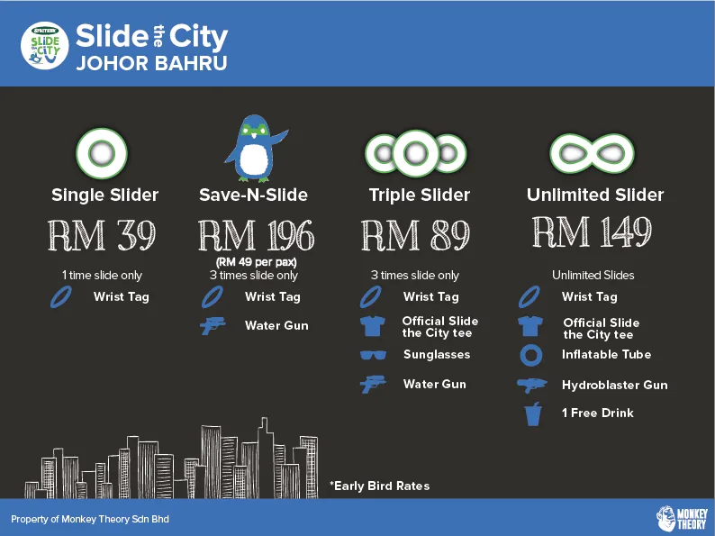 Let’s face it, nobody will want to go to an event of this scale and have a go at the giant water slide only once. Luckily, Spritzer Slide the City Malaysia is now offering some exciting packages for those of you who want to get the best out of your day! Choose from the Tripler Slider, Unlimited Slider, and Save-n-Slide packages for you and your family/friends to slide multiple times. Get your tickets here.