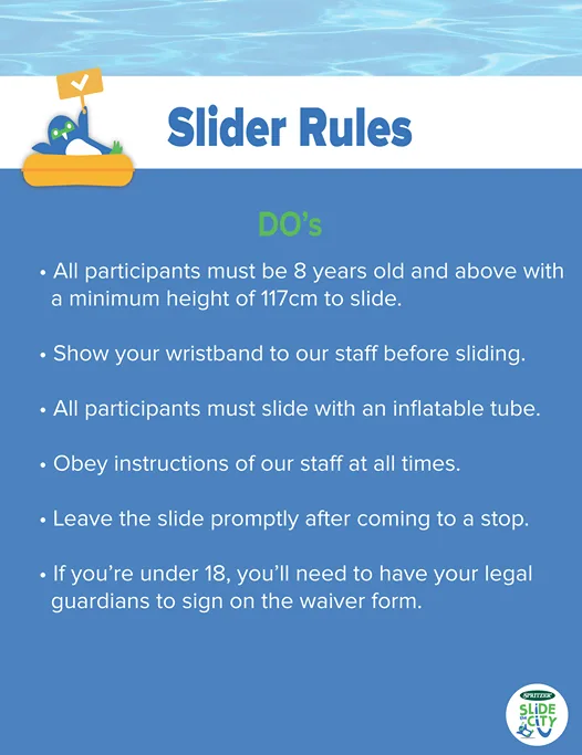To ensure everyone will have a safe and enjoyable sliding experience, participants are expected to follow a few rules at the event: