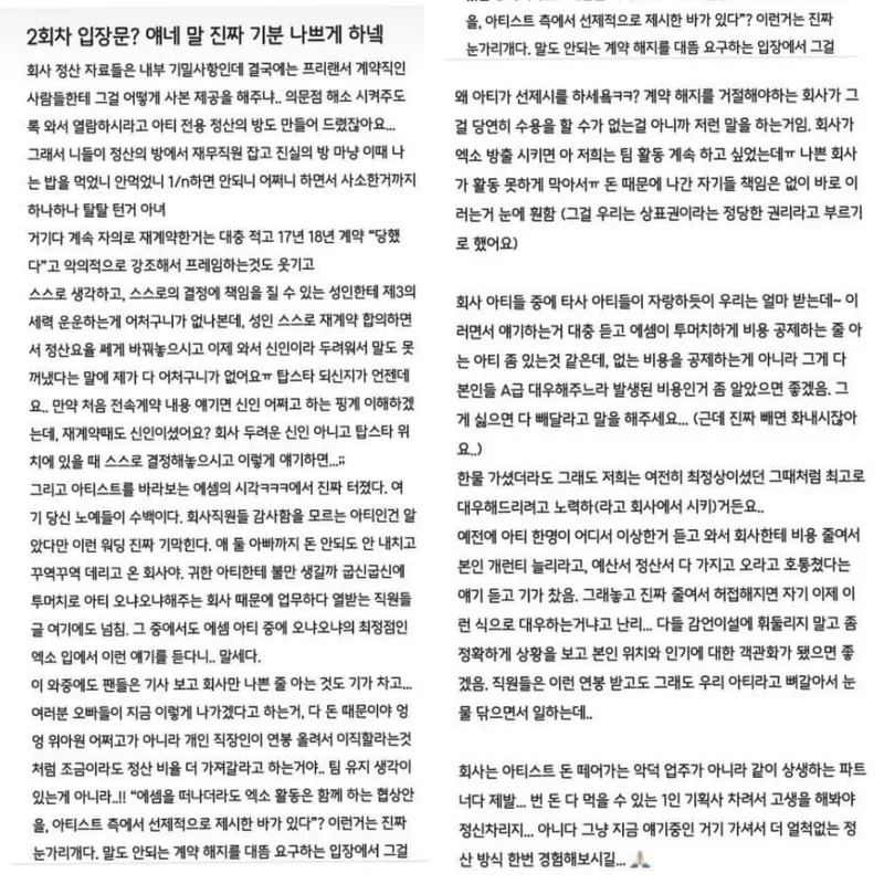 In the lengthy post, the employee started off by criticising the idols’ request to see a transparent settlement report, claiming that those documents are classified. “The company’s accounting documents are the company’s secrets, so how are we supposed to give them to freelancers and contracted employees (artists)? We even made an artist-only space for you to come to inquire and look over the document,” they wrote.