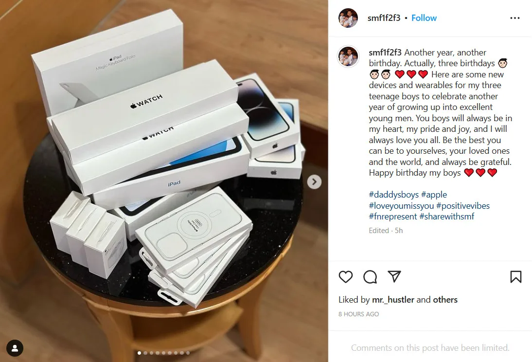 “Another year, another birthday. Actually, three birthdays. Here are some new devices and wearables for my three teenage boys to celebrate another year of growing up into excellent young men. You boys will always be in my heart, my pride and joy, and I will always love you all. Be the best you can be to yourselves, your loved ones and the world, and always be grateful. Happy birthday my boys ❤️❤️❤️,” the caption reads.