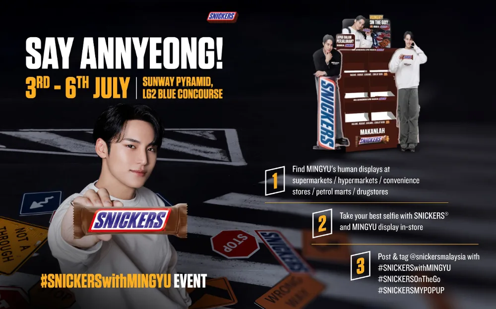 Dubbed the “#SNICKERSwithMINGYU” event, the SNICKERS pop-up will be open at Sunway Pyramid Shopping Mall from 3rd to 6th July 2025 (Thursday to Sunday). It’s likely that the pop-up is to promote the chocolate bar brand and will include exciting activities and promotions. At the same time, SNICKERS Malaysia is also holding a contest for fans to win a fast pass to the event.