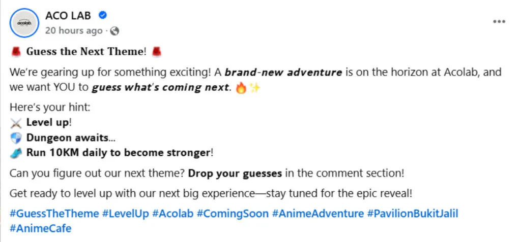 ACO Lab recently dropped several hints for the theme of their next pop-up, which are “Level Up”, “Dungeon awaits…” and “Run 10KM daily to become stronger!”. Also included was a teaser poster with the word “ARISE” on top, which seemed to reference the title of the role-playing game based on the series.