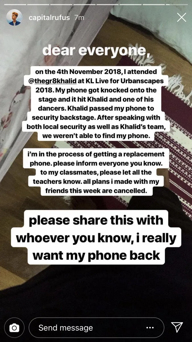 “My phone got knocked onto the stage and it hit Khalid and one of his dancers. Khalid passed my phone to security backstage,” he explained in one of his Instagram stories.