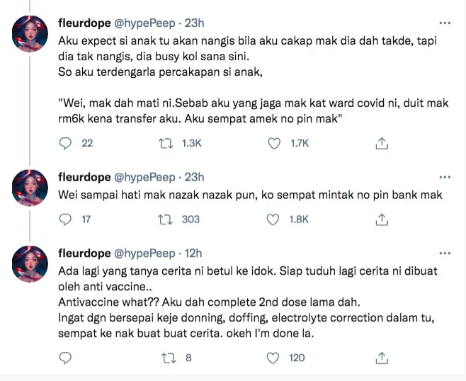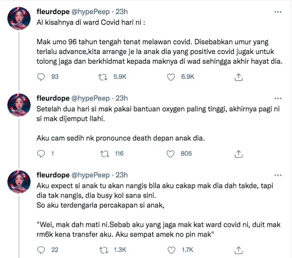 Unfortunately, the elderly woman sadly passed away two days later. What is even more shocking, the individual also claimed to have heard the person’s conversation on the phone. He informed that his mother had died and because he had taken care of her at the hospital, he demanded RM6,000 for his help! He even managed to acquire the pin number of the late mother’s bank account.
