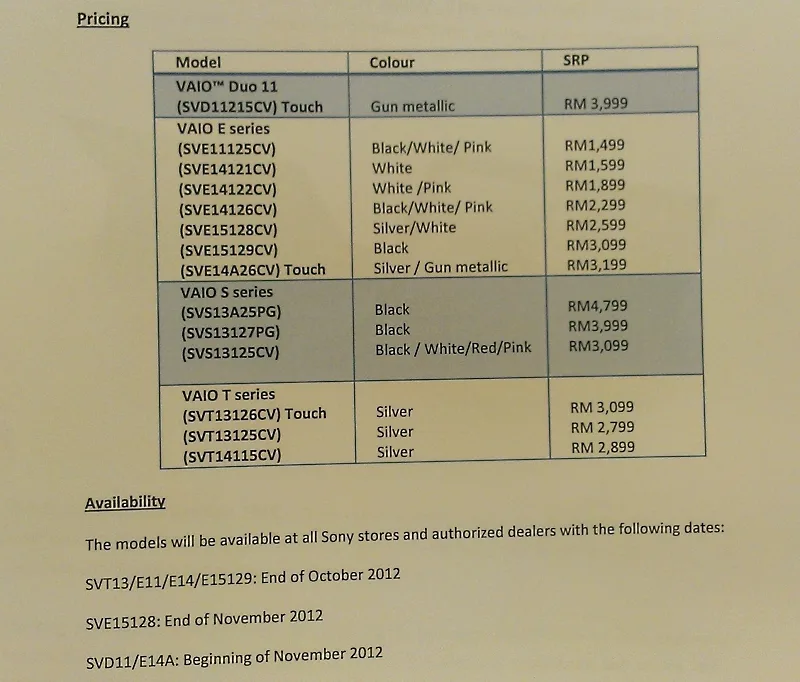 The new family of VAIO PCs from Sony will be available from all Sony stores and authorized dealers from November 2012. For the pricing deets, refer to the following: