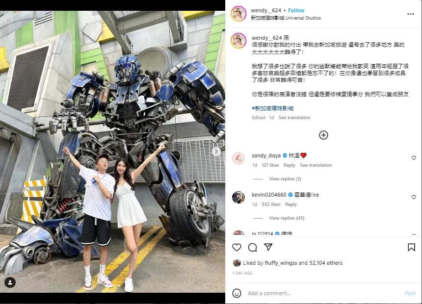 “Thank you so much for your devotion to me. You took me to travel to Singapore and many other places. It’s really rare!” Wendy wrote. She added that she appreciates her experiences with Soon Sun and has learned a lot from them. “You’re a great showman, but (you) still need to (learn more about love),” Wendy said, before reassuring fans that they were still friends.