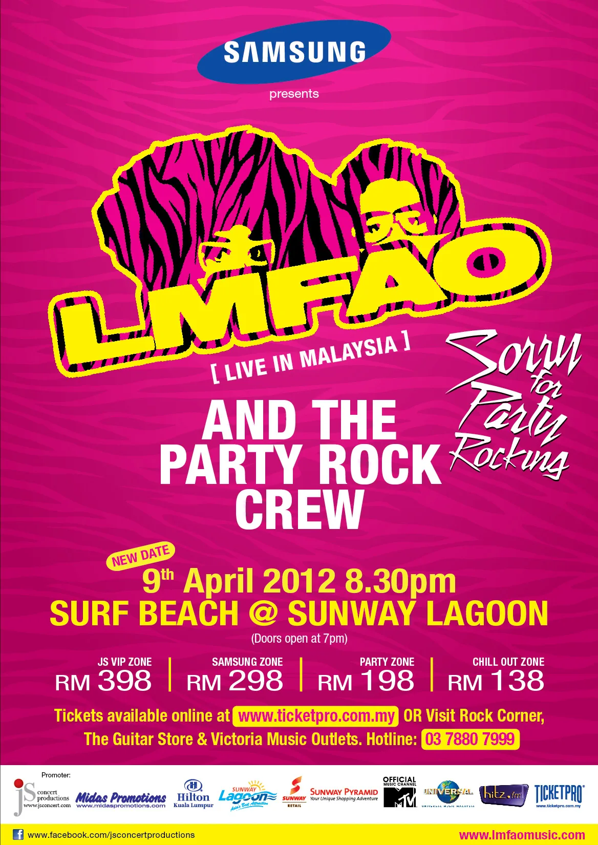 LMFAO Live in Malaysia 2012 is brought to you by official title sponsor, Samsung Malaysia Electronic Sdn. Bhd. and concert promoter, JS Concert Productions. Event details are as follows: