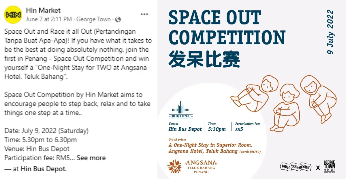 “If you have what it takes to be the best at doing absolutely nothing, join the first in Penang – Space Out Competition and win yourself a “One-Night Stay for TWO at Angsana Hotel, Teluk Bahang”,” the post reads. “Space Out Competition by Hin Market aims to encourage people to step back, relax and to take things one step at a time.”