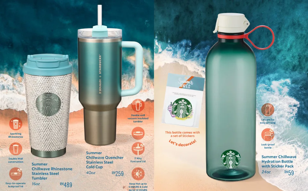 The collection features the Stanley Summer Chill Wave Quencher Cold Cup (RM259), designed with double-wall vacuum insulation to keep drinks hot for up to 5 hours or cold for up to 12. Also included in the collection is the sparkling Summer Chillwave Rhinestone Stainless Steel Tumbler (RM489), adding a touch of glamour, and the Hydration Bottle with a playful sticker pack (RM59), letting you personalise your bottle while staying refreshed all day.