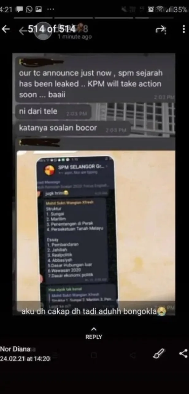 According to The Star, a text message with a list of topics in the structured and essay portions of the paper were circulated on WhatsApp, just moments before the paper began at 10am yesterday (Wednesday, 24th February).