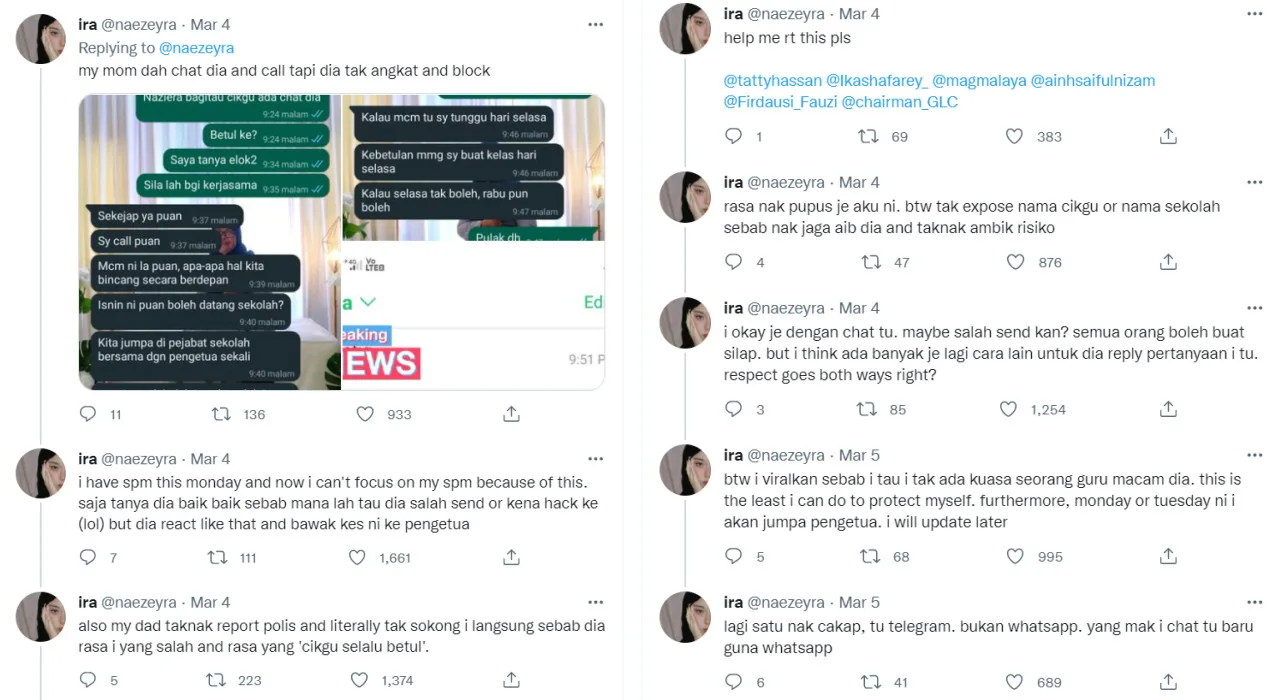 To make things worse, Ira also said that she was condemned by other teachers at her school after posting about the incident on her social media. She revealed, “Basically, the other teachers will back him up. There’s also some who even spread screenshots of the news excerpts on this incident to other WhatsApp groups.”