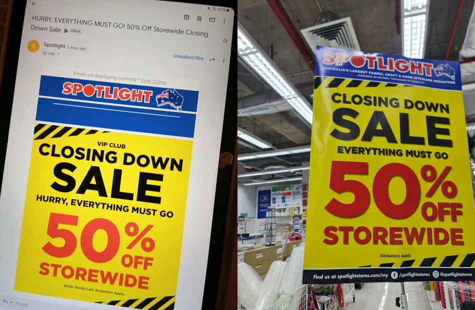 Word has been circulating that Spotlight, the popular Australian home and craft retailer, will be closing its remaining two outlets in Malaysia sometime this year. The brand is particularly well-known among crafters and DIY enthusiasts who purchase items for art projects. Those subscribed as VIP members were informed of the news via email, where the brand announced a 50% off closing-down sale on all items (this only applies to VIP members).