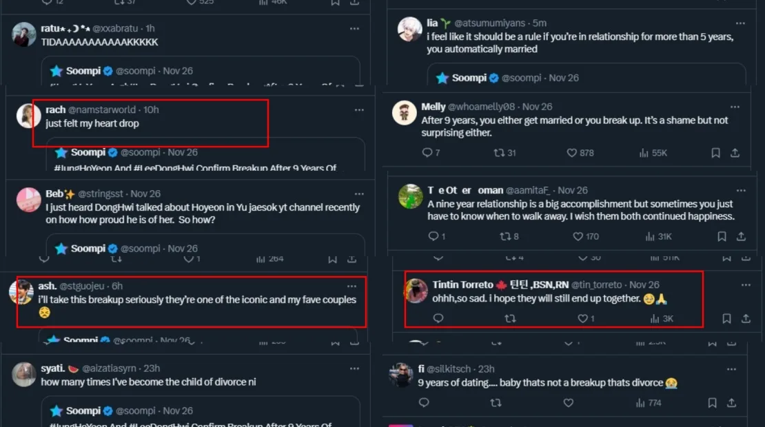 Throughout their careers, Jung Ho Yeon and Lee Dong Hwi have been nothing but supportive of each other and have openly and affectionately expressed their love for one another during interviews. After going public in 2016, the former lovebirds were first met with a great deal of criticism due to their 9-year age gap. Now, fans have expressed their disbelief at the sudden breakup, as seen in the screenshots above.