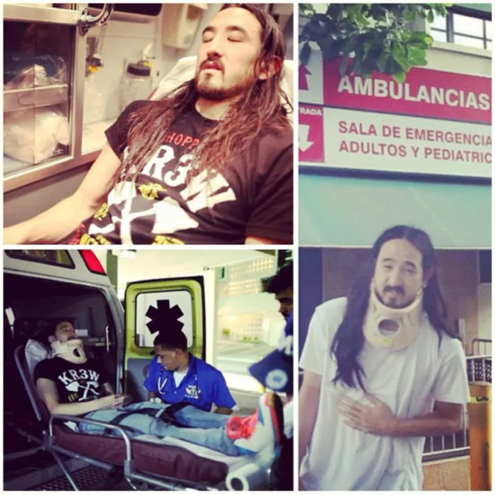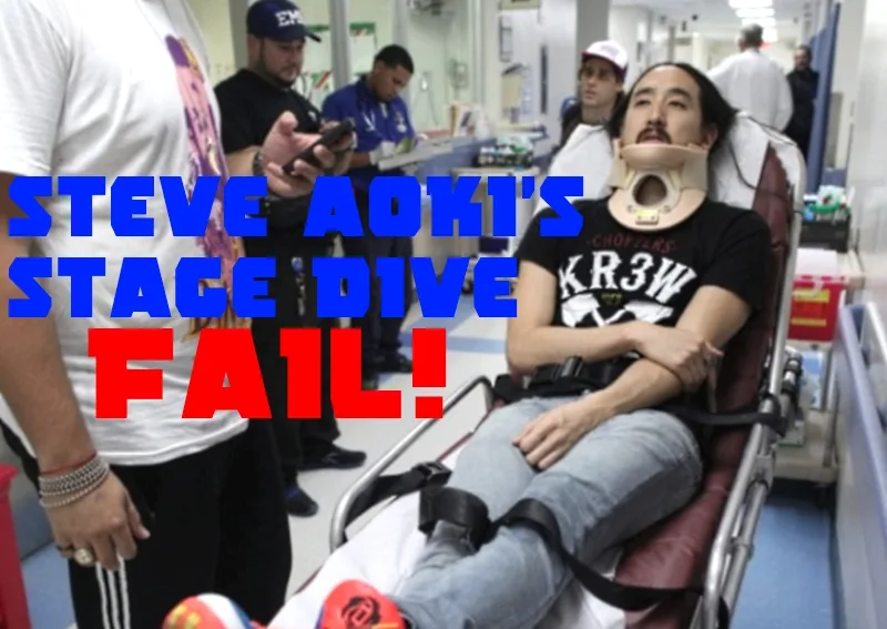 During his show in Puerto Rico, the Dim Mak label head attempted his stunt but it went awry. Steve had attempted to jump off the DJ console and onto a trampoline, and eventually (we think) he was hoping to land into the crowd for a bit of his crowd-surfing routine. Sure, on paper it all sounds awesome.