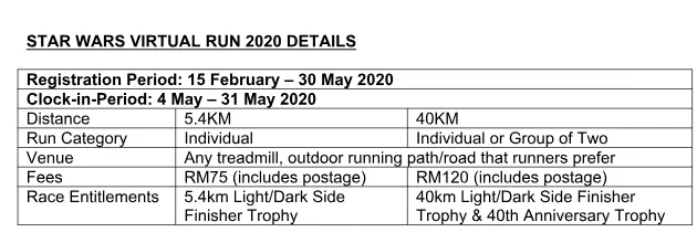 Update (30th April): Due to the Covid-19 situation, the Star Wars Virtual Run 2020 has been rescheduled to begin on 15th June instead of 4th May.