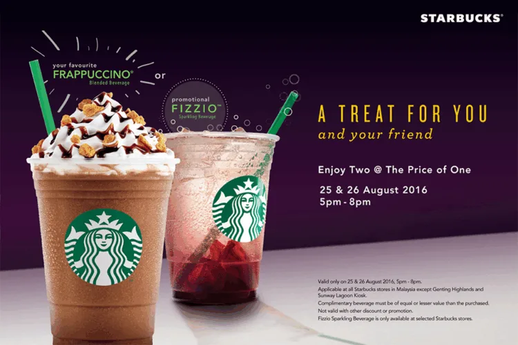 For a limited time, Starbucks Malaysia is offering a Buy 1 Free 1 promotion when you purchase the Frappuccino Blended Beverage or the Fizzio Sparkling Beverage.