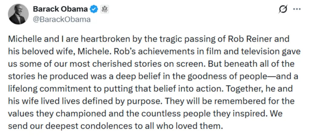 The couple died from an apparent homicide, with police still investigating the case. Rob is the son of the late actors Carl Reiner and Estelle Reiner. After getting a start in showbiz as an actor, Rob made his directorial debut in 1984 with “This Is Spinal Tap”. He would go on to direct many hit films, including “Stand By Me”, “When Harry Met Sally” and “Misery”. Many stars and public figures have reacted to Rob and Michele’s tragic passing. Here’s what they said: