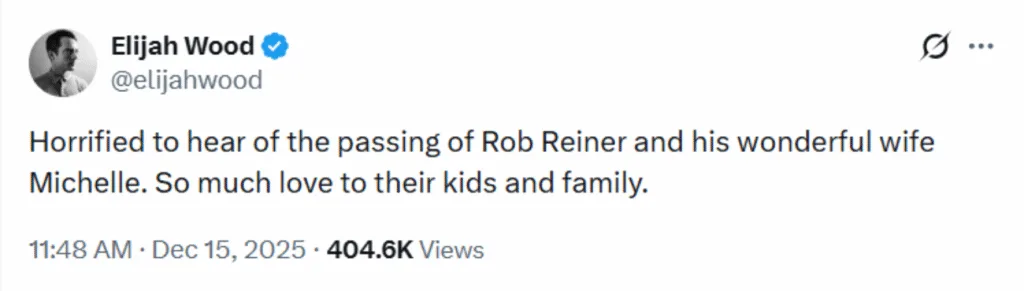 Actor Elijah Wood worked with Rob on the 1994 film “North”, in which the actor played the lead role. In a Twitter post, he mourned the passing of the filmmaker, writing, “Horrified to hear of the passing of Rob Reiner and his wonderful wife Michelle. So much love to their kids and family.”