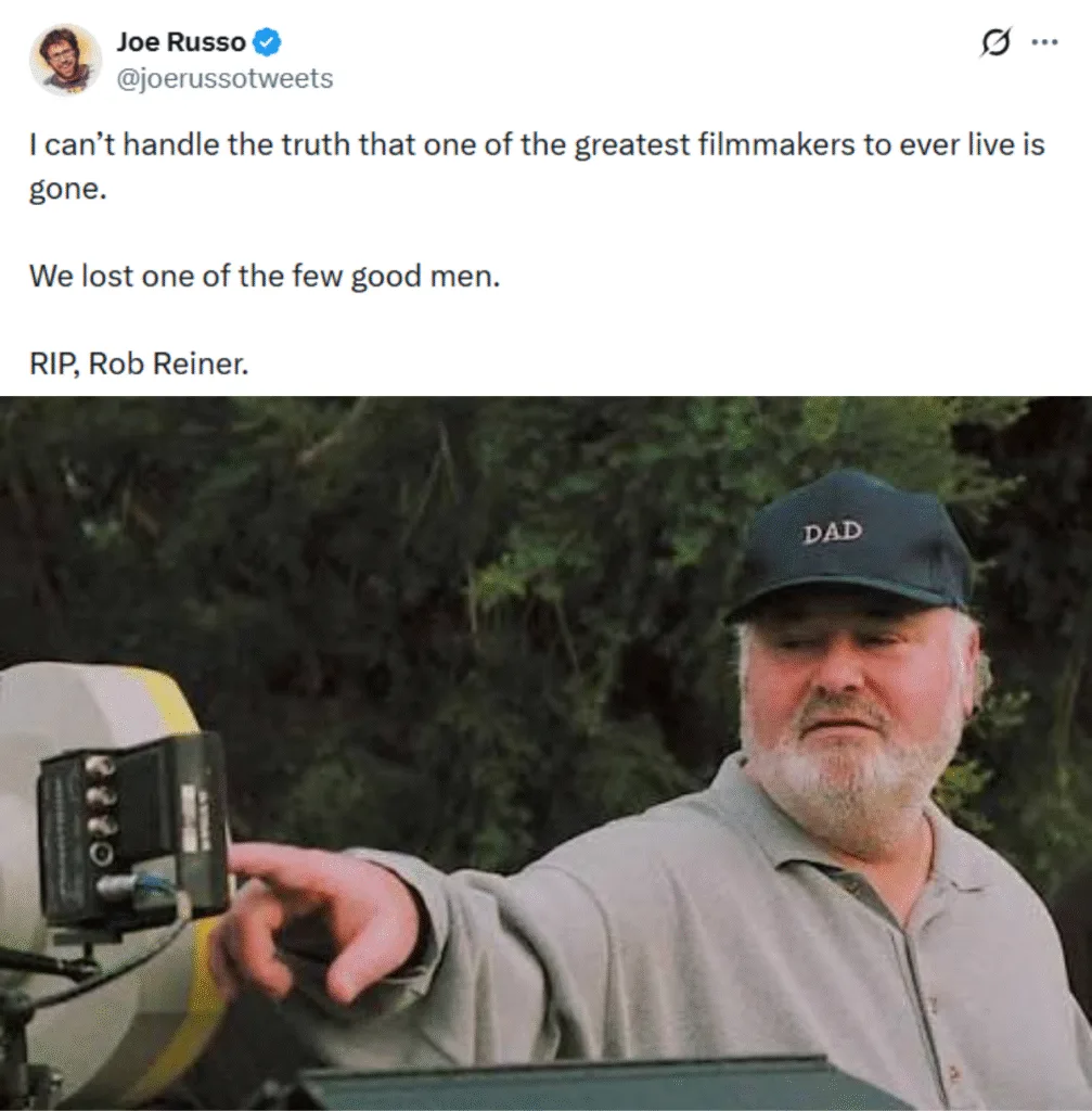 Another filmmaker to mourn Rob’s passing is Joe Russo, a.k.a. one-half of the Russo Brothers. In his Twitter post, the director wrote, “I can’t handle the truth that one of the greatest filmmakers to ever live is gone. We lost one of the few good men. RIP, Rob Reiner.”