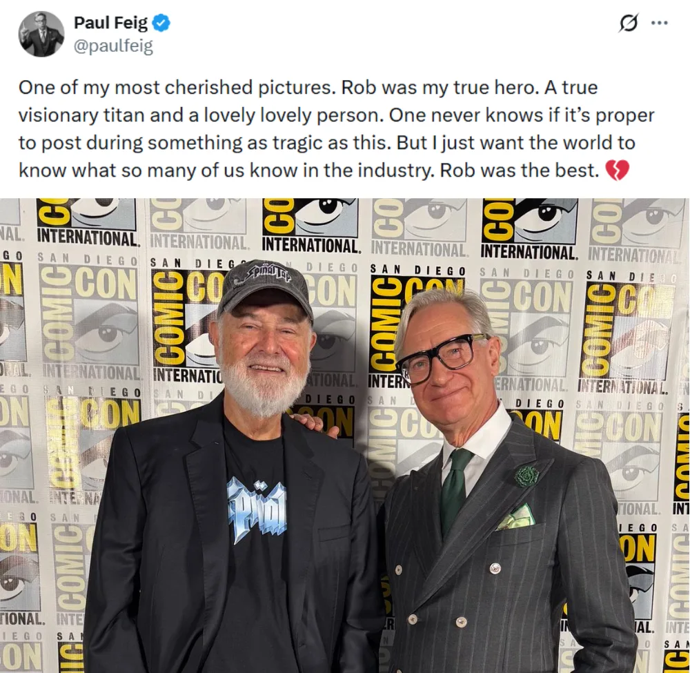 Paul Feig also shared a tribute to his fellow filmmaker, calling Rob his “true hero” and “a true visionary titan and a lovely lovely person” in a Twitter post. The “Bridesmaid” director added, “One never knows if it’s proper to post during something as tragic as this. But I just want the world to know what so many of us know in the industry. Rob was the best.”