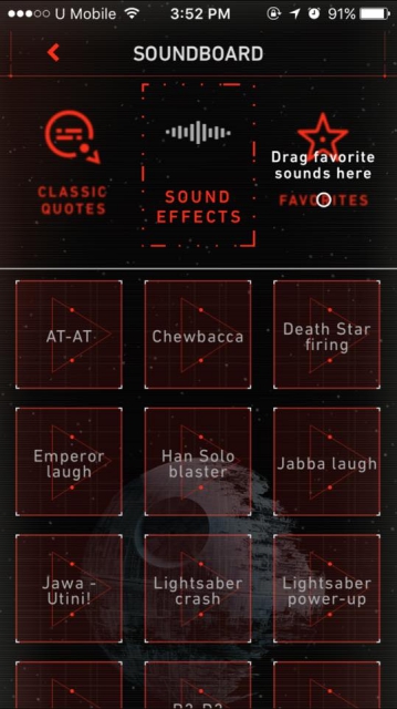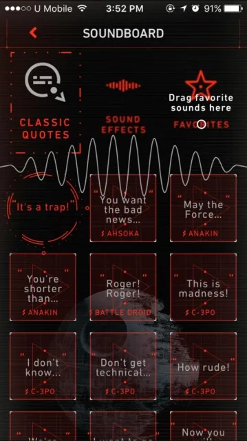 For a fun interactive experience, the app allows fans to play classic sound clips and sound effects from their favorite “Star Wars” characters, creatures, weapons, vehicles, and scenes. It also featureds the franchise’s iconic quotes, such as , the infamous “I am your father” soundbite and Luke Skywalker’s responding: “Noooooooooo!”
