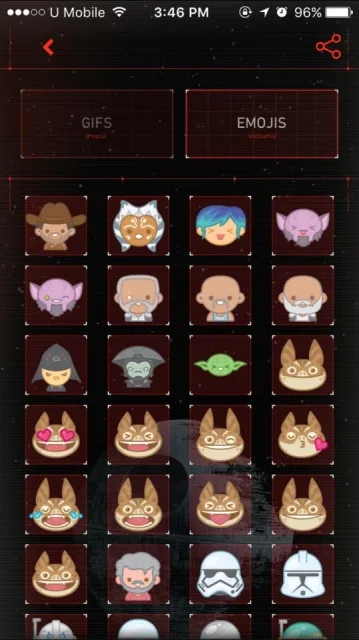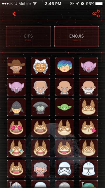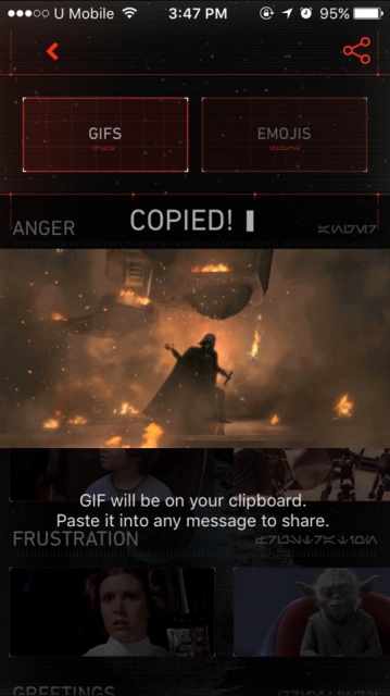 Fans can share animated GIFs with friends and family of memorable scenes and characters from the Star Wars movies and TV shows, including “Star Wars: The Force Awakens” and “Star Wars Rebels”.