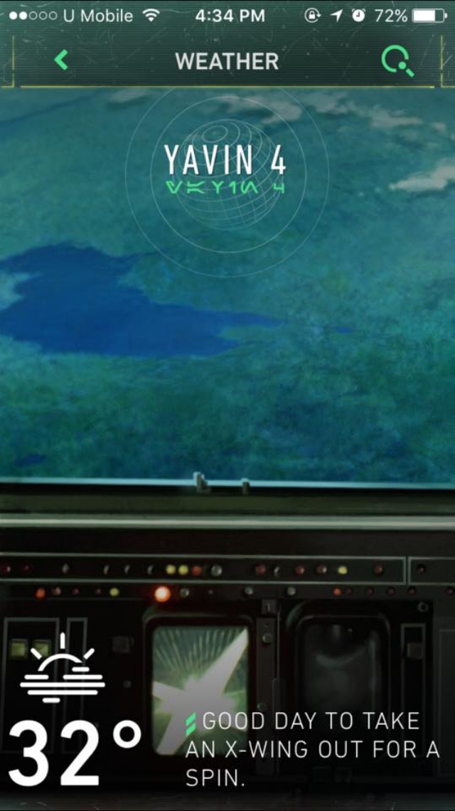 Featuring original art and parallax effects of in-universe planets and locales, the “Star Wars” app features “Star Wars”-themed weather and 5-day forecasts.