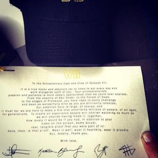 In addition to a going off party, it also appears that the film’s cast and crew received a note signed by director J.J. Abrams and producers Kathleen Kennedy and Bryan Burke, thanking them for working on Episode VII. The note was tweeted out on Friday and has since been pulled, but the image was rehosted by SlashFilm.